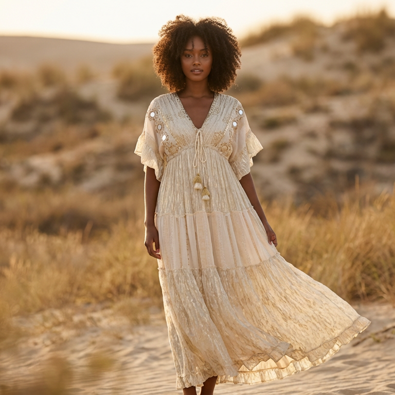 Nossa coleção inclui vestidos indianos longos e midi, batas bordadas em algodão e viscose, túnicas versáteis para o dia a dia, saias longas estampadas, conjuntos coordenados e acessórios como bijuterias e lenços. Cada peça carrega a tradição de técnicas centenárias de bordado como Chikankari, Kantha, Mirror Work e Block Print.