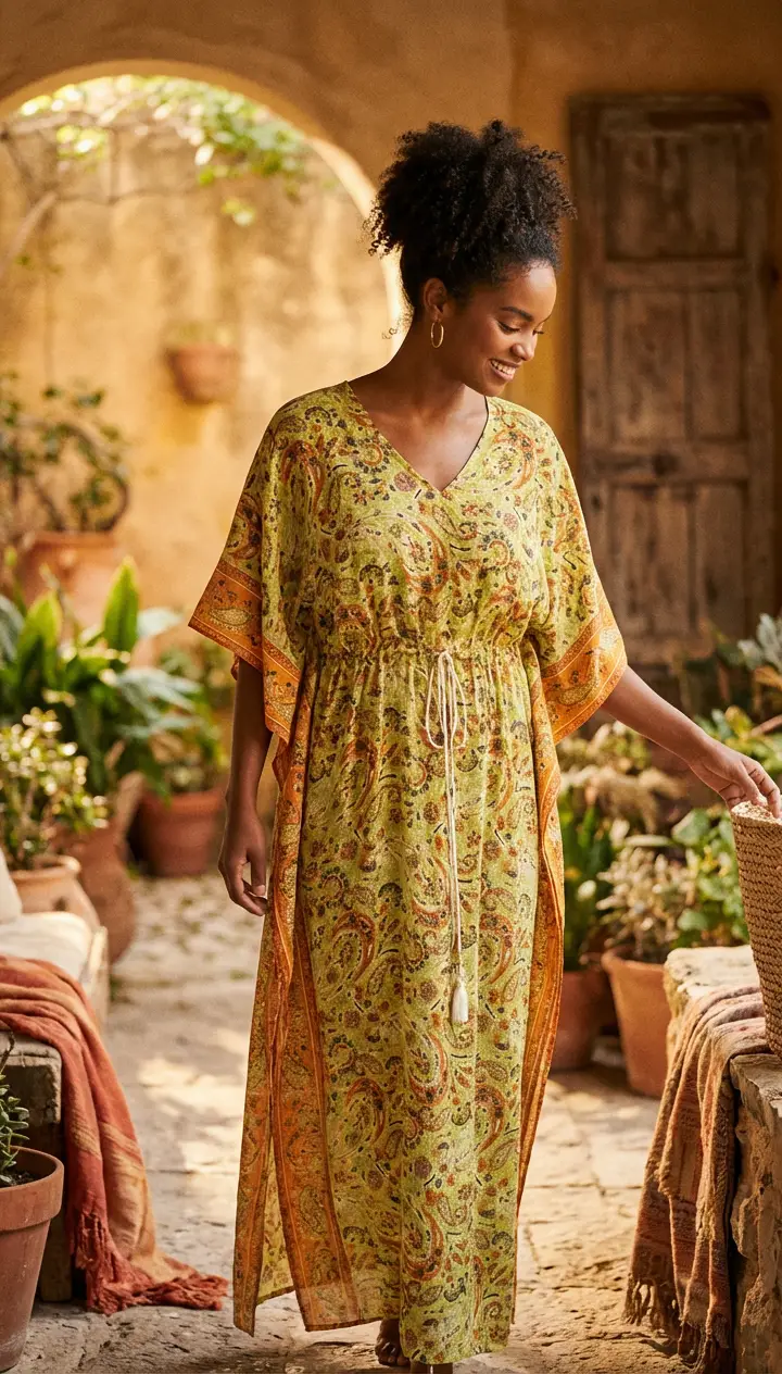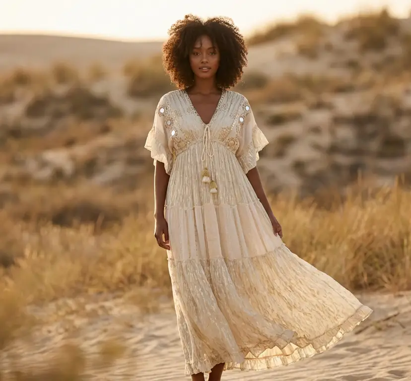 Nossa coleção inclui vestidos indianos longos e midi, batas bordadas em algodão e viscose, túnicas versáteis para o dia a dia, saias longas estampadas, conjuntos coordenados e acessórios como bijuterias e lenços. Cada peça carrega a tradição de técnicas centenárias de bordado como Chikankari, Kantha, Mirror Work e Block Print.